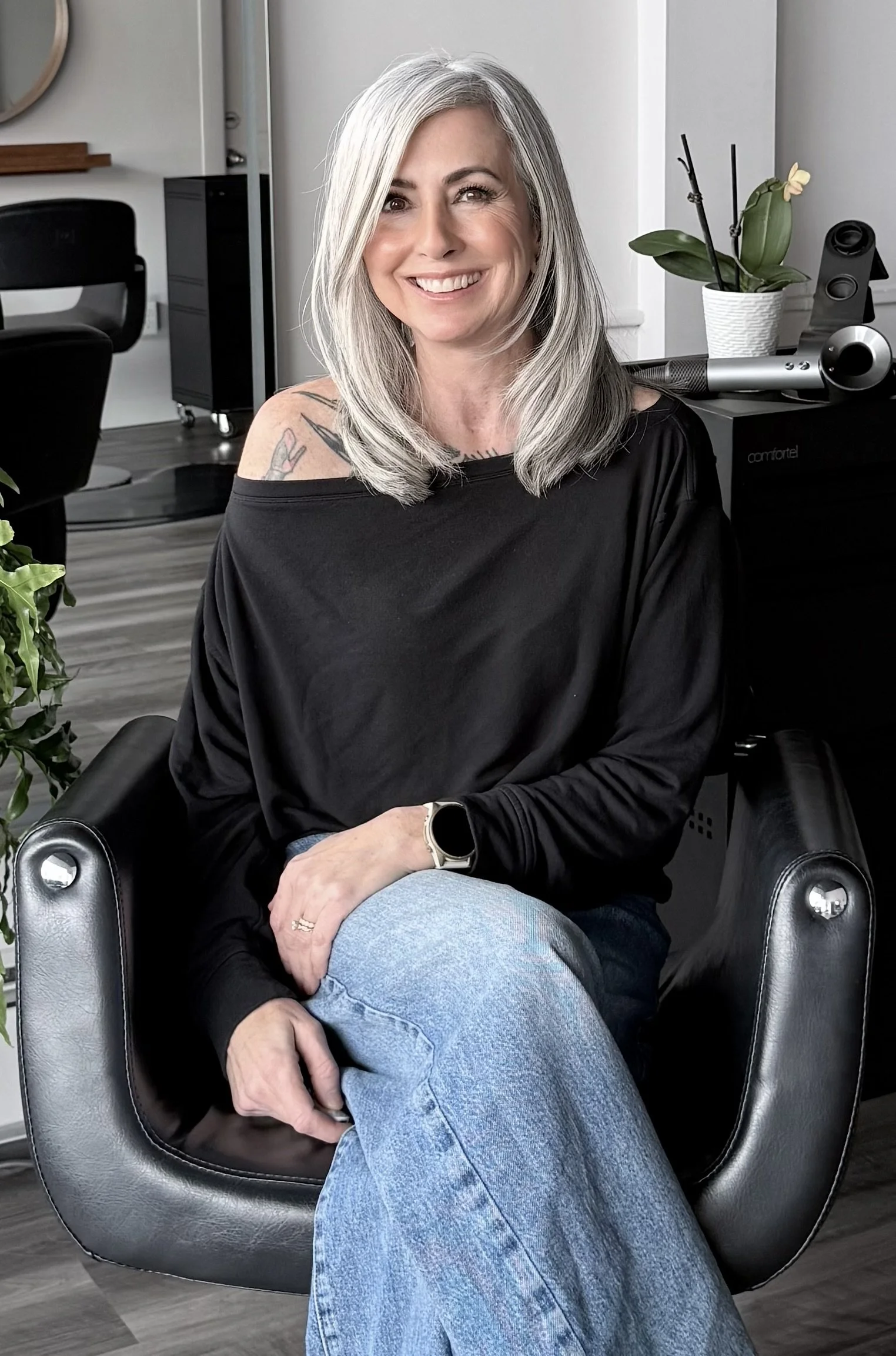 My goal is to help the hair frustrated guest that struggles with their gray hair. I specialize in the gray hair journey whatever that may be for you. There is no wrong way to work with your gray. Your journey could be to blend your gray, completely cover your gray, or transition to gray. Gray hair texture can be frustrating also and that is where I will help. As a sliver haired sister myself, I can relate! I will take your hair from frustrating to fabulous with color, cut and haircare.